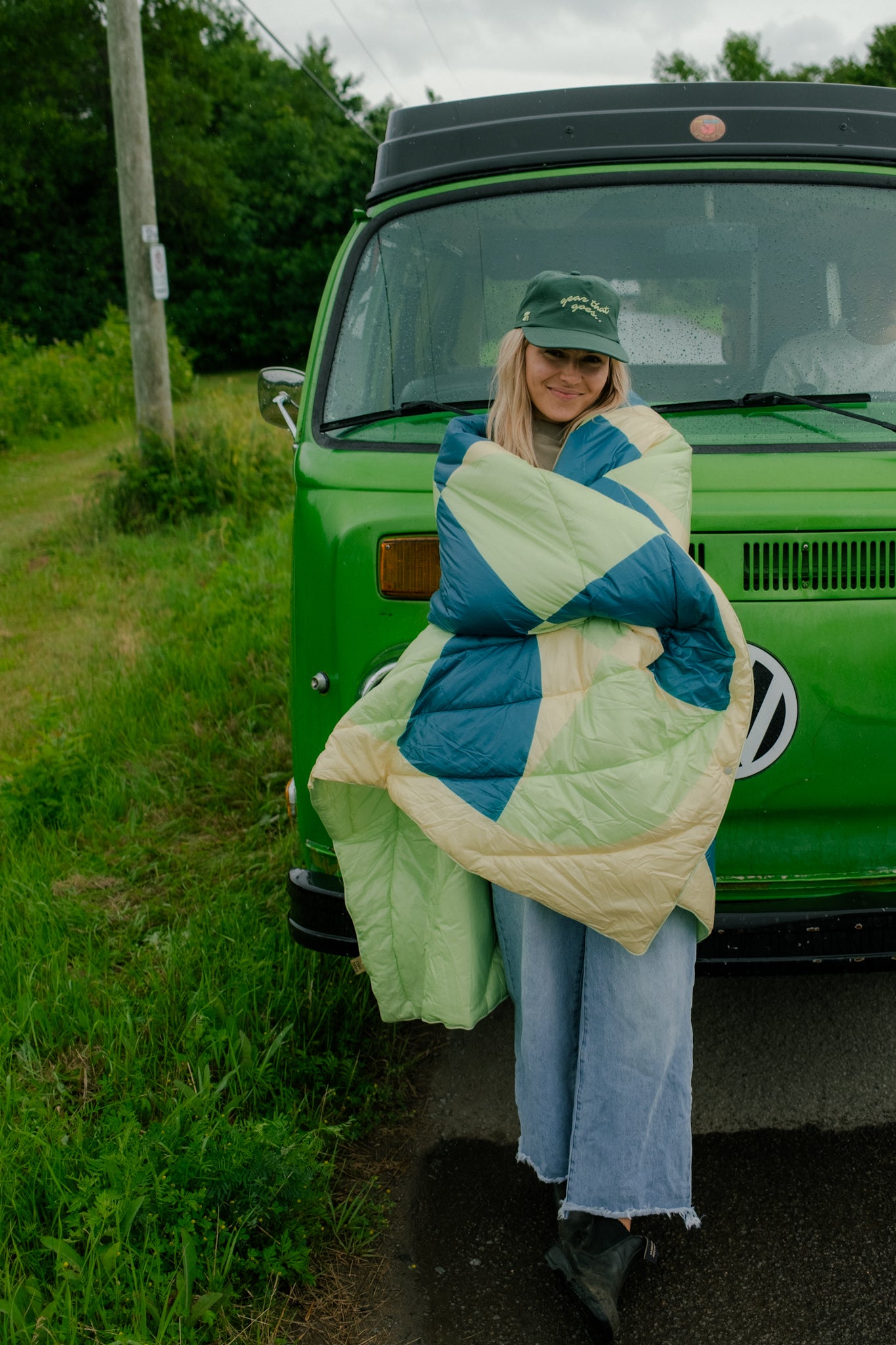 inspired by the tranquility of Muskoka's lakes, this blanket evokes misty mornings by the water, forests lining the shores, and golden rays of sunlight piercing through the evergreens. Its hues of deep green, lake blue, and soft yellow recall the vibrant and peaceful nature of this iconic Ontario region.