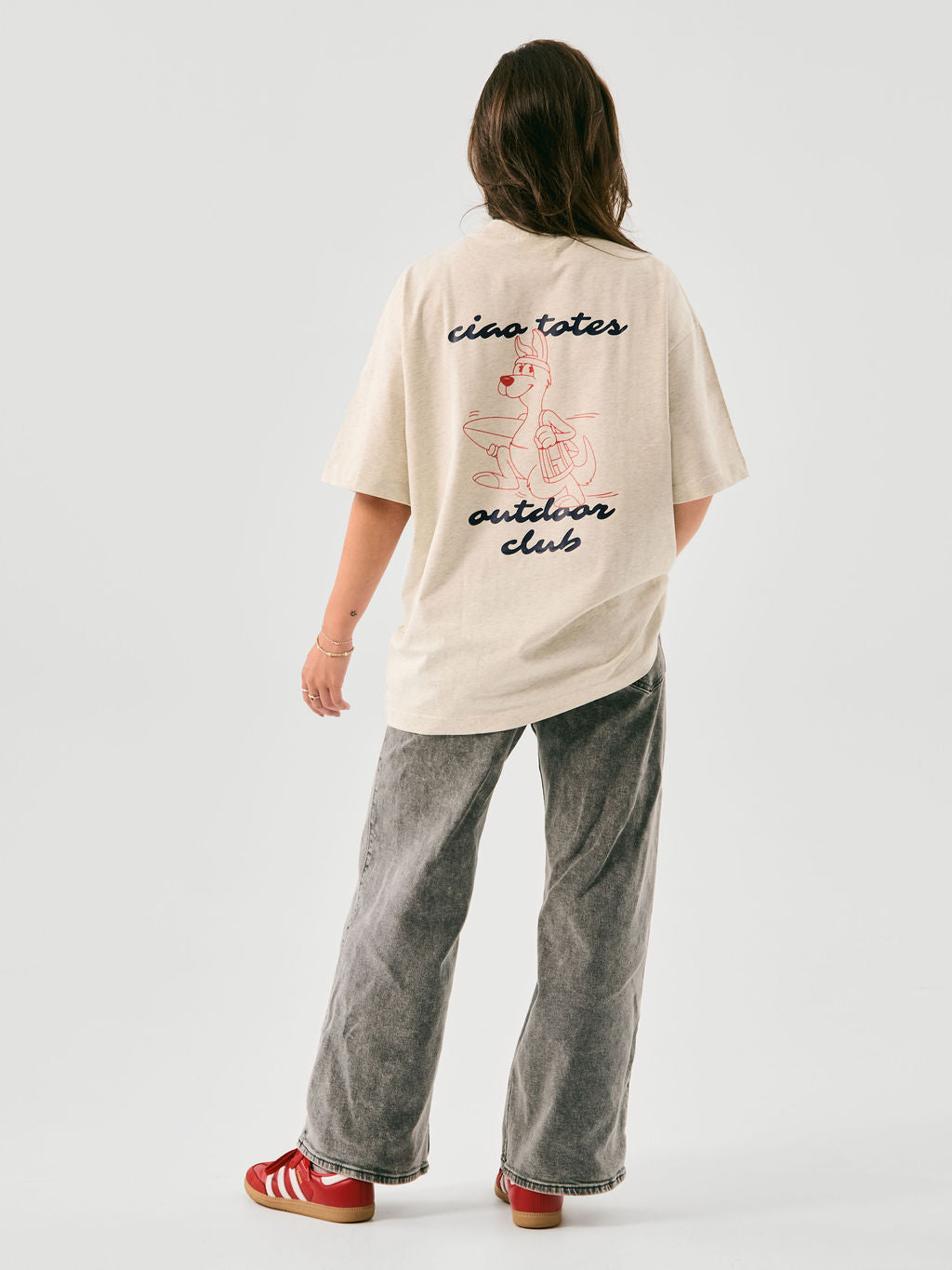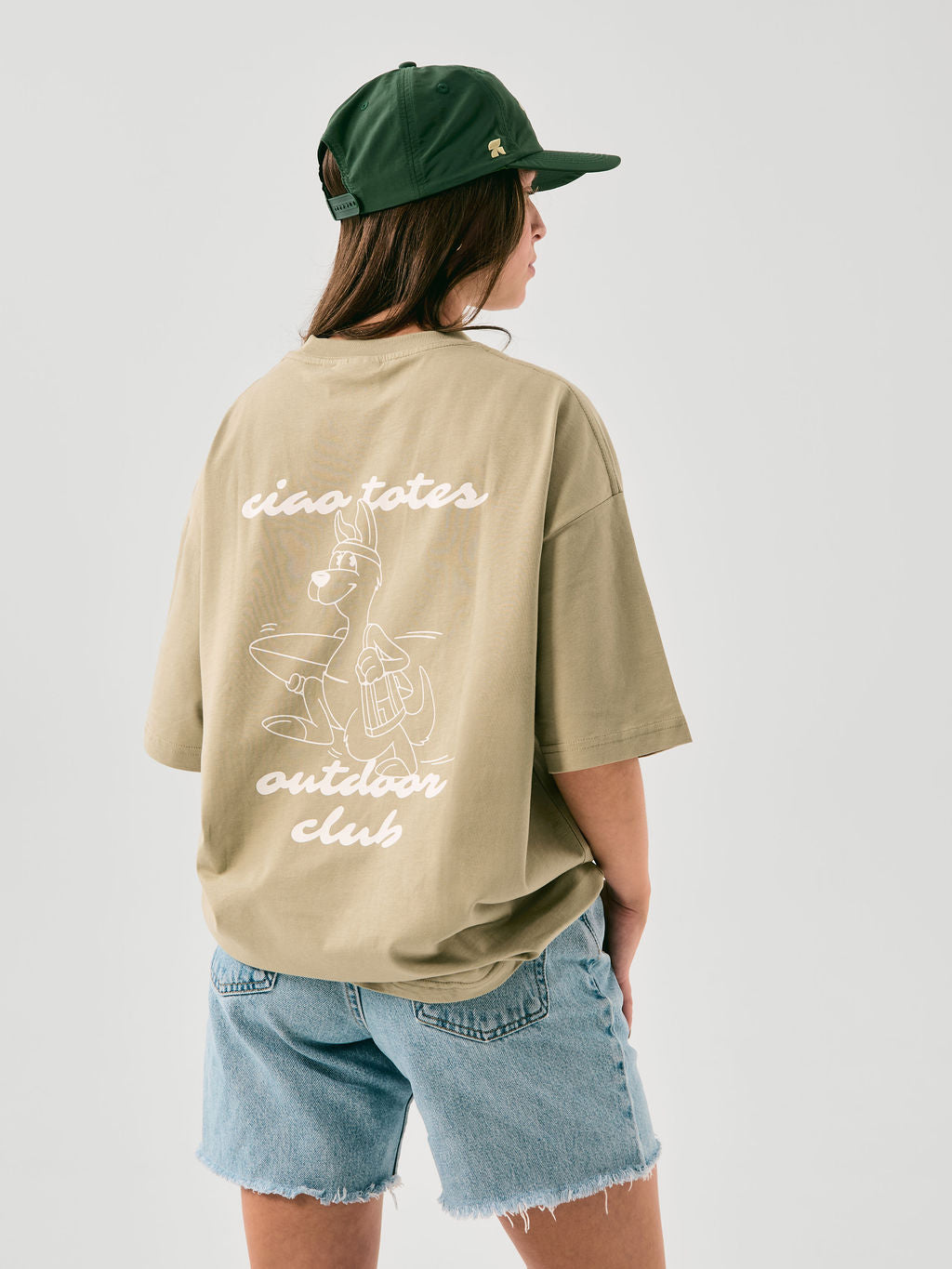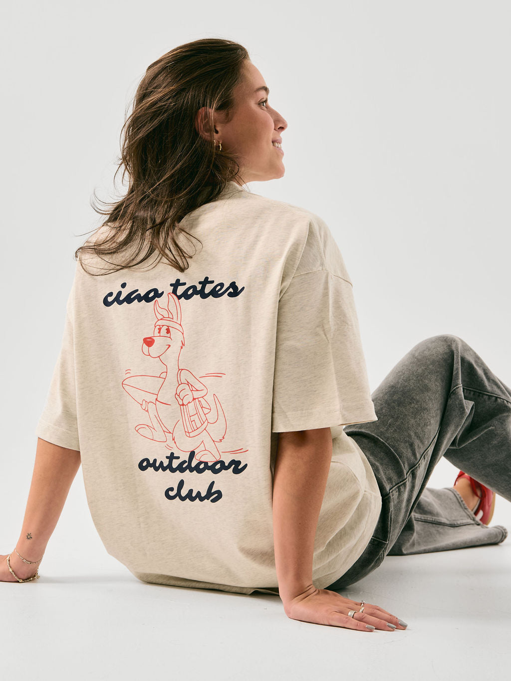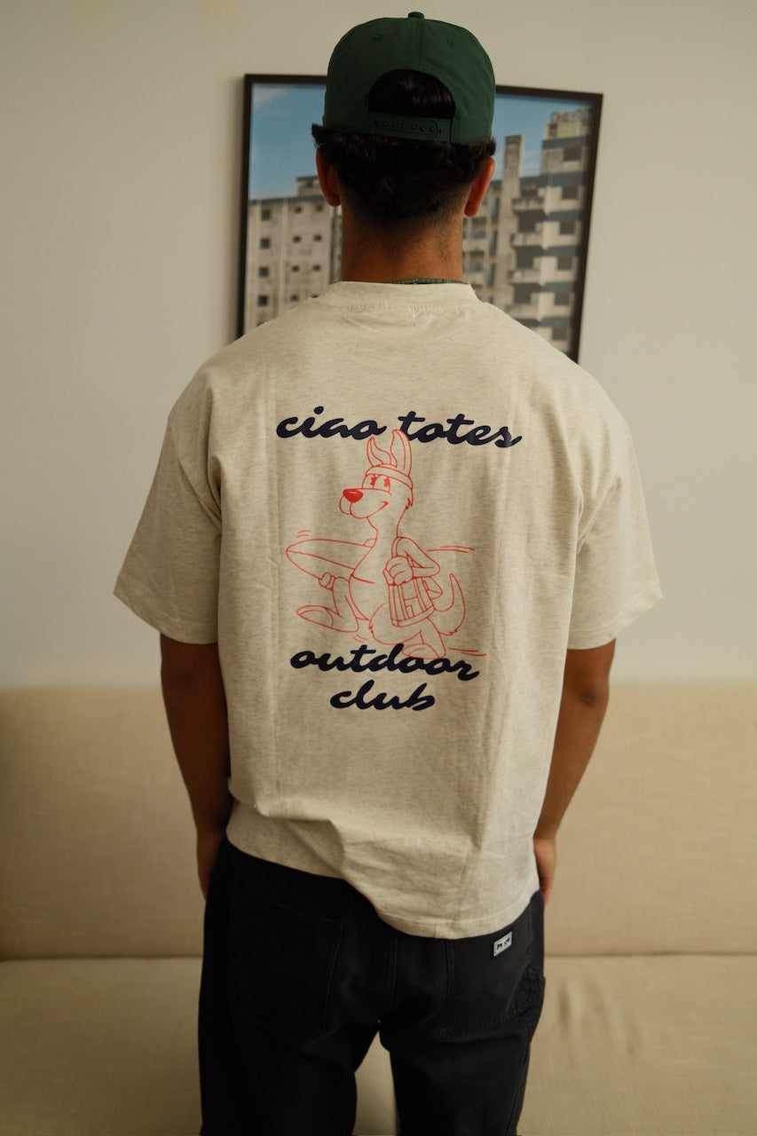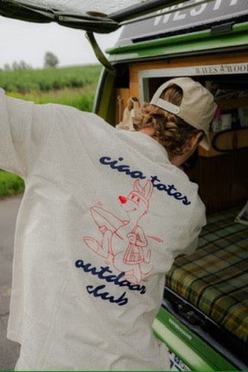 le tee-shirt ciao club adopte une coupe oversize ample. le motif du kangourou rend hommage à nos débuts, rappelant l’esprit pratique de notre premier fourre-tout : avoir l’essentiel à portée de main, prêt à vous suivre partout.